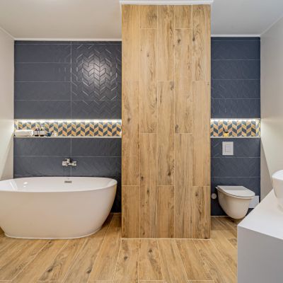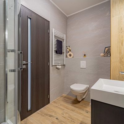 Két külön - luxus minőségű - fürdőszobája van, egyik kádas, másik zuhanykabinos. Mindkettőben prémium burkolatok, szaniterek és szekrények vannak.