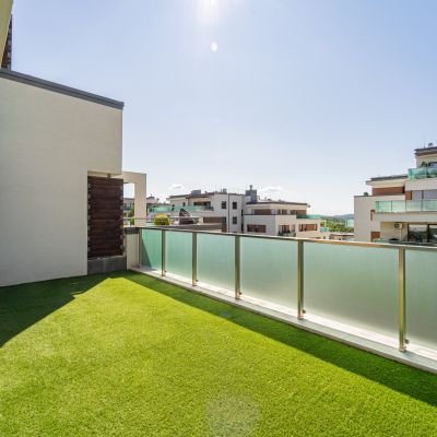 A terasz 30 nm-es, Holland Pázsit egyedi prémium műfűvel leburkolva. Vízkiállás is van a teraszon. Igen tágas, akár kültéri étkező-ülőgarnitúra és jakuzzi is elhelyezhető rajta.