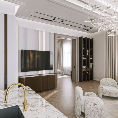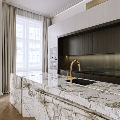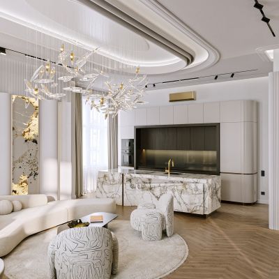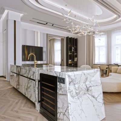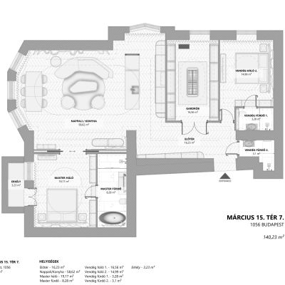 Eladó a Március 15. téren egy 140 m²-es, 2. emeleti, Dunára, Erzsébet hídra és Budai Várra néző luxuslakás, 3 m²-es erkéllyel. A 54 m²-es nappalit egyedi gipszstukkó, design világítás és hátulról megvilágított Patagonia quartzite fal teszi különlegessé. A konyhát monumentális márványhatású sziget uralja, a hálók elegáns gipsz installációkkal, LED fényekkel gazdagítottak. Exkluzív burkolatok, prémium szaniterek, teljes berendezés. Átadás: 2025 dec.