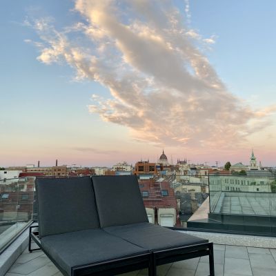 A lakás egészét körülöleli a Várra, a Budai-hegyekre és a Dunára, illetve a Parlamentre panorámás terasz,