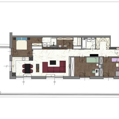 A praktikus elrendezésű lakásban az amerikai konyhás nappali és a hálószobák mellett két fürdőszoba és