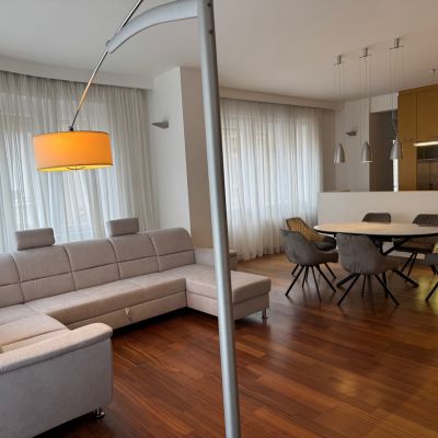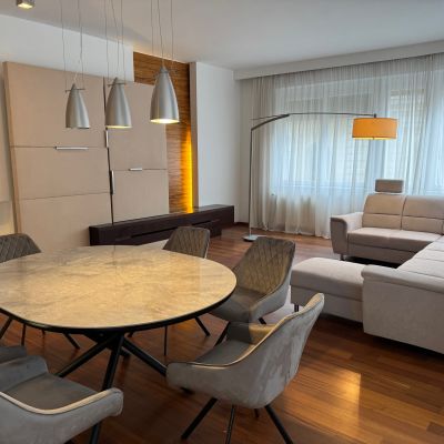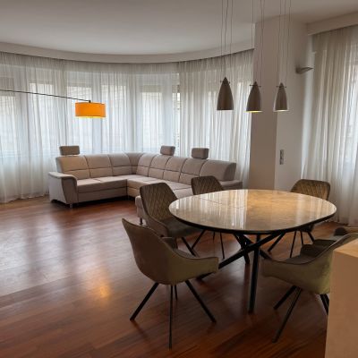 Belváros szívében, liftes ház 4. emeletén kiadó egy dupla komfortos, belsőépítész által tervezett saroklakás, panorámás kilátással két utcára.