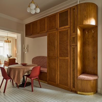 - tágas előtér étkezővel és egyedi tervezésű fa előszobabútorral