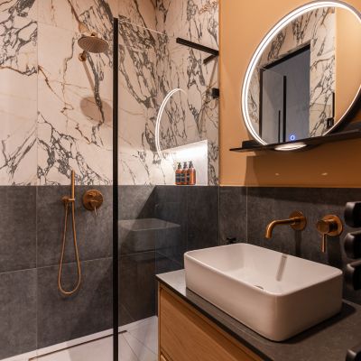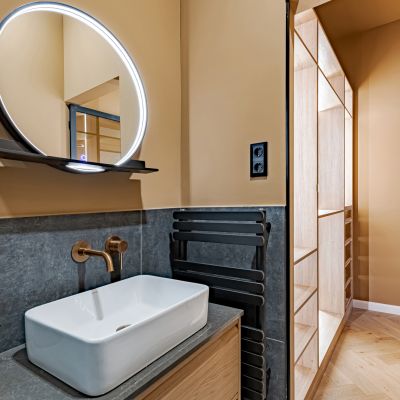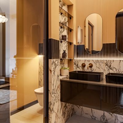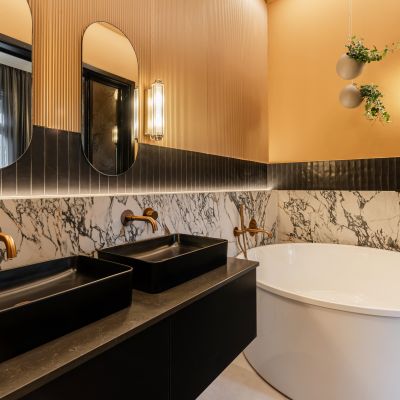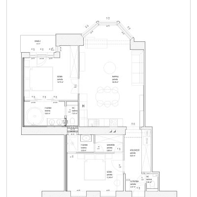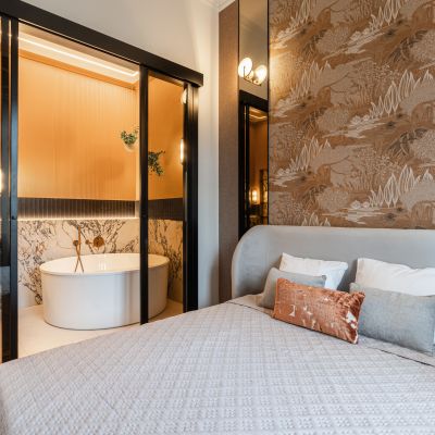 A 87 m²-es elegáns otthonban két háló, két fürdő és egy tágas amerikai konyhás nappali kapott helyet, tele kreatív megoldásokkal és prémium anyaghasználattal.