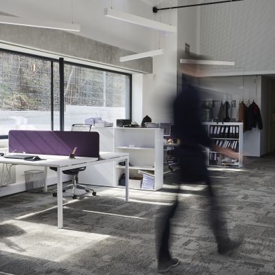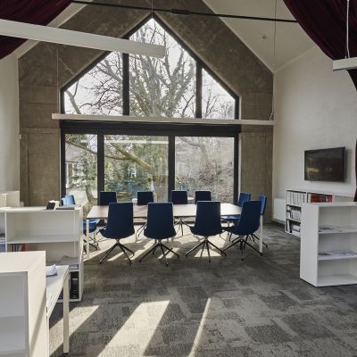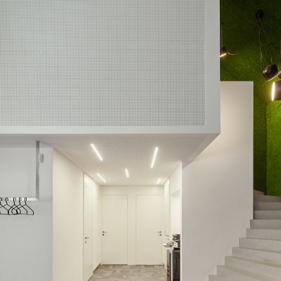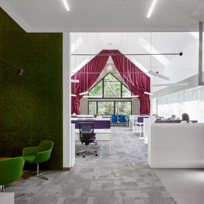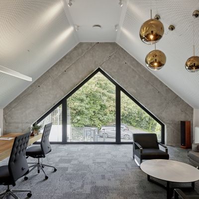 A kelet-nyugati tájolású épületben az ipari örökség és a kortárs design tökéletes egyensúlyban van. Az üvegfelületek lehetővé teszik, hogy a fény egész nap átjárja a tereket, miközben a geometrikus formák már az érkezés pillanatától kezdve egyedülálló hangulatot teremtenek. A munkateret elválasztó vörös színházi függöny nemcsak esztétikai élményt nyújt, hanem hangszigetelő funkciója is biztosítja a zavartalan koncentrációt. A tárgyalóból nyíló kilátás pedig egyedülálló panorámát kínál, amely a hegyvidék és az ipari örökség harmóniáját tükrözi.