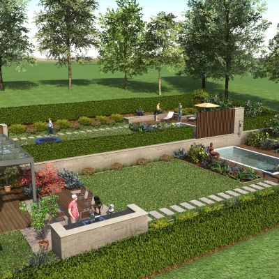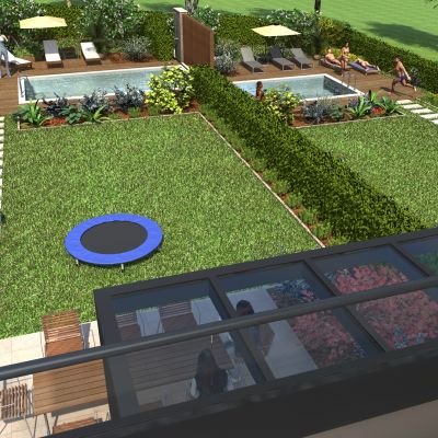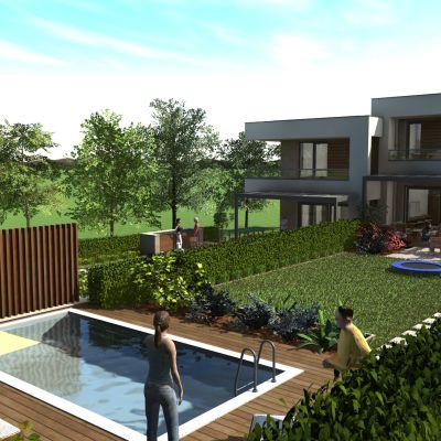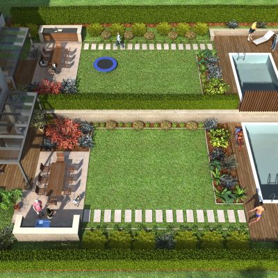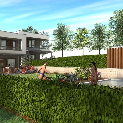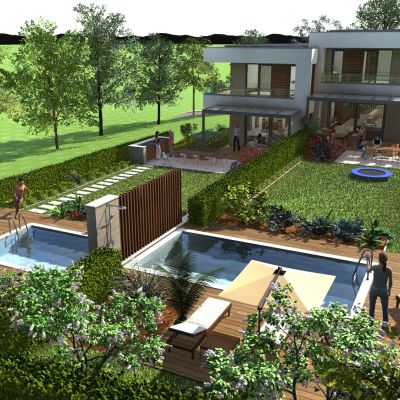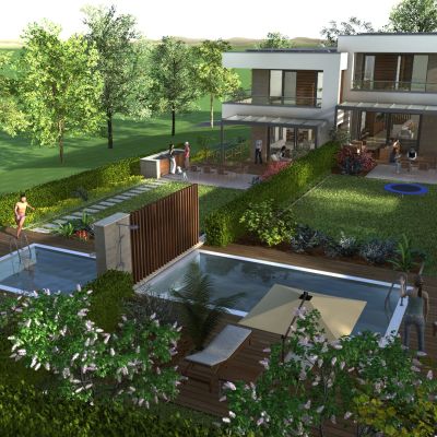 Gyepszőnyeg, dísznövények, automata öntöző, robotfűnyíró, 6×3 m fűtött medence, távolról vezérelhető díszvilágítás, nyári konyha.