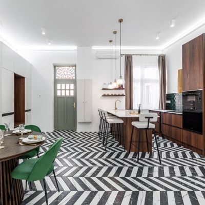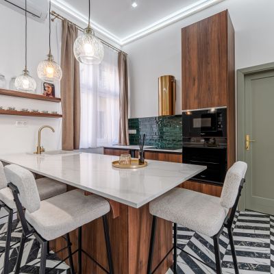 A felújítás napokkal ezelőtt fejeződött be, a lakás teljesen bútorozott és gépesített, klasszikus és modern elemek harmonikus kombinációjával.