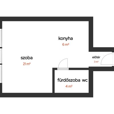- egy 21 nm-es parkettás szoba, egy 6 nm-es konyha, 3 nm-es előtér, 4 nm-es fürdőszoba és wc egy helyiségben;