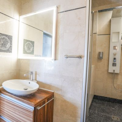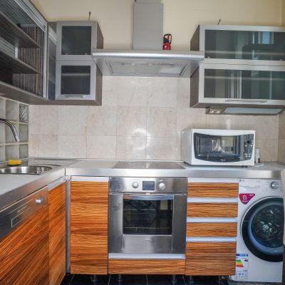 -gránit, márvány burkolatok a vizes helyiségekben, és vörösfenyő parketta a nappali+hálóban.