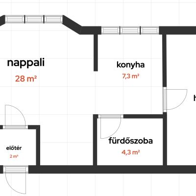 - egy 28 nm-es parkettás nappali, 11.5 nm-es hálószoba, egy 7 nm-es konyha, 4 nm-es fürdőszoba és wc egy helyiségben és a 3.5 nm-es előtér;