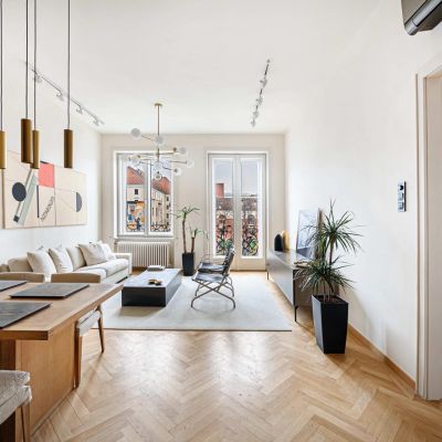A Károly körúton, közvetlenül a Deák térnél, Budapest egyik legjobb lokációjában kínáljuk ezt a 100 m²-es prémium minőségben felújított lakást. Elosztását tekintve amerikai konyhás nappali, két hálószoba, külön gardrób, exkluzív fürdő és városi panorámás kilátással rendelkező nagyméretű erkély. Az ingatlan az elmúlt két évben teljes körű műszaki és esztétikai felújításon esett át prémium anyaghasználattal és egyedi tervezésű beépített bútorokkal.
