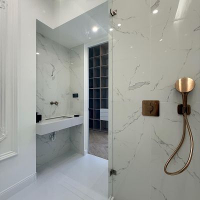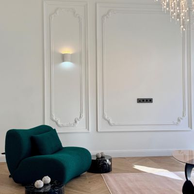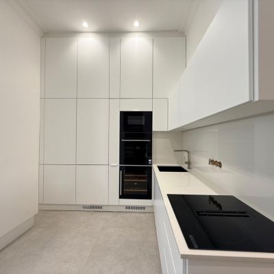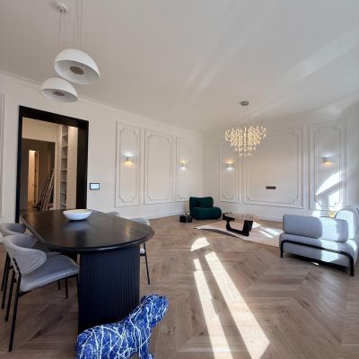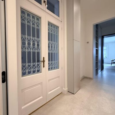 A fotókon is látható, igényesen felújított enteriőr a klasszikus polgári hangulatot modern eleganciával ötvözi: stukkódíszes falak, halszálkás parketta, design csillár és letisztult burkolatok teremtenek exkluzív, mégis otthonos atmoszférát. Az elektromos árnyékolók és a gondosan megtervezett elrendezés prémium életérzést nyújtanak.