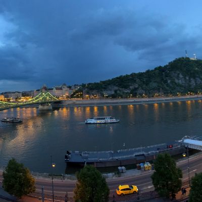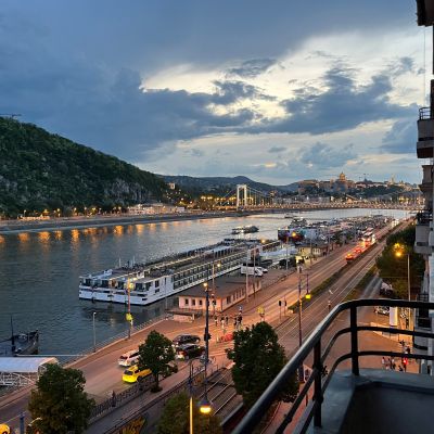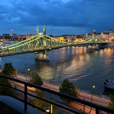 A nappali konyha étkező egységéből nyíló, teljes Duna-panorámás erkély a lakás egyik különleges eleme. A Gellért-hegy, a Szabadság híd és a Citadella látványa innen minden napszakban lenyűgöző – a reggeli kávé vagy az esti borozás tökéletes helyszíne.