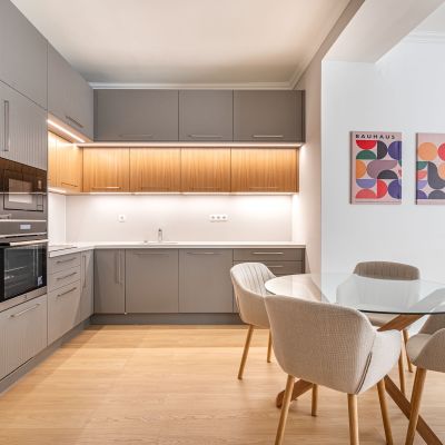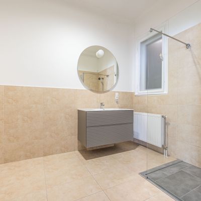 Egyedi, azonos stílusú, teljesen gépesített konyha és fürdőszoba bútorok, integrált corián munkapult, mosogató, kézmosó, igényes szaniterek.