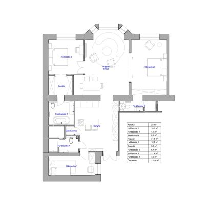 Az ingatlan alapterülete 119 m² (tulajdoni lapon 115 m²), elosztása: nappali, 3 hálószoba, 3 fürdőszoba, valamint különálló konyha.