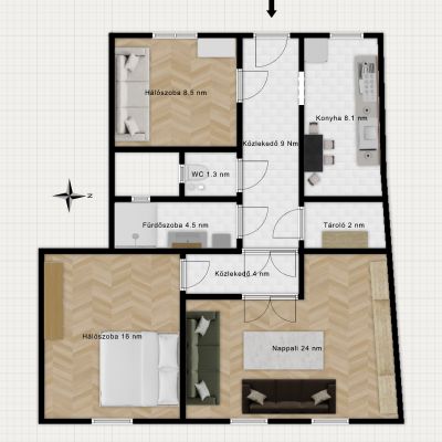 A lakásban található egy 24 nm-es nappali, 16 nm-es hálószoba, 8.5 nm-s félszoba, valamint egy 9 és 4 nm-s közlekedő, 8 nm-es nyugati tájolású ablakos konyha, 4.5 nm-es fürdőszoba és mellékhelyiség külön, valamint egy 2 nm-es kamra. A felújítás során megújultak a nyílászárók, a teljes elektromos és vízvezeték hálózat, valamint a burkolatok.